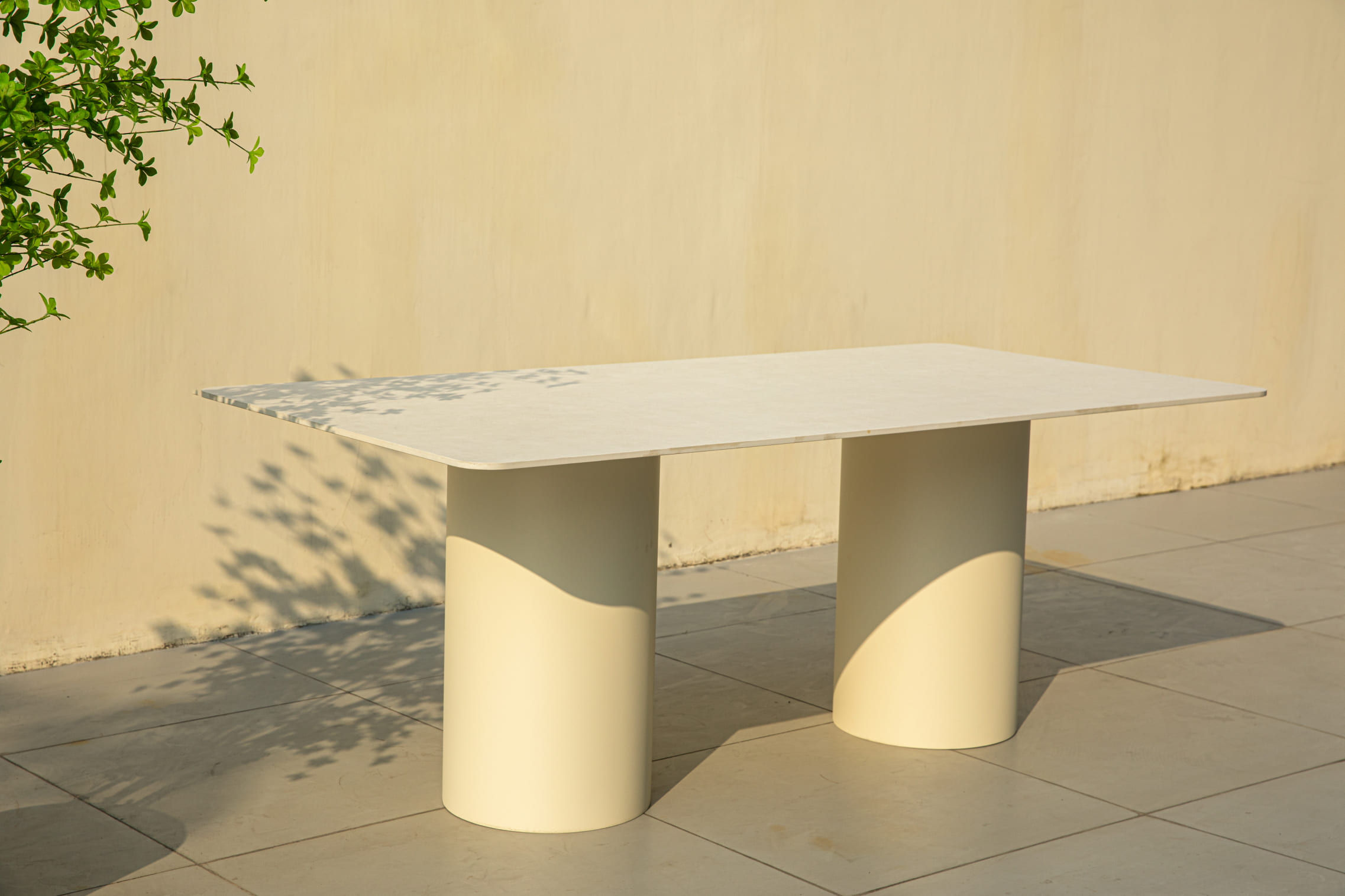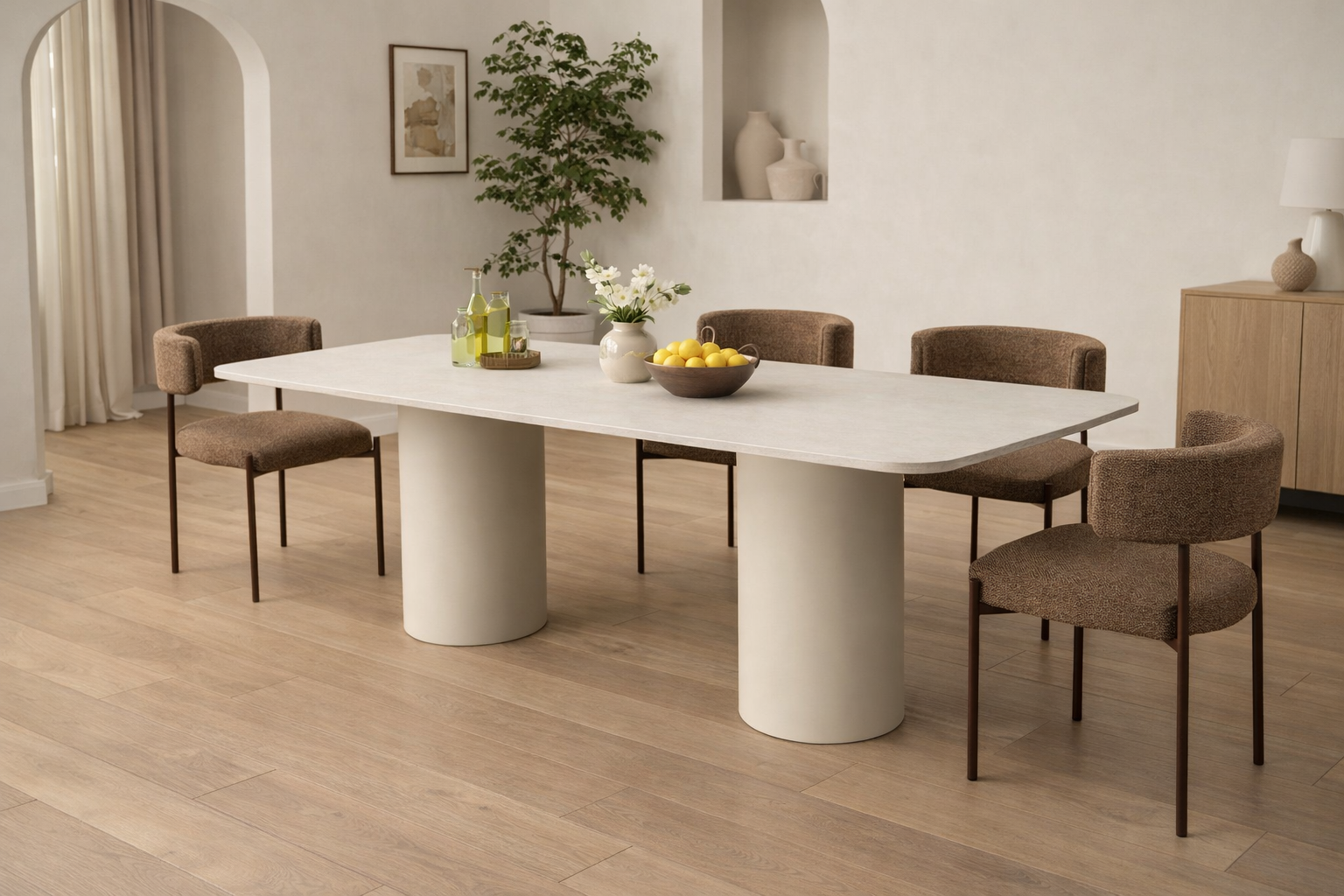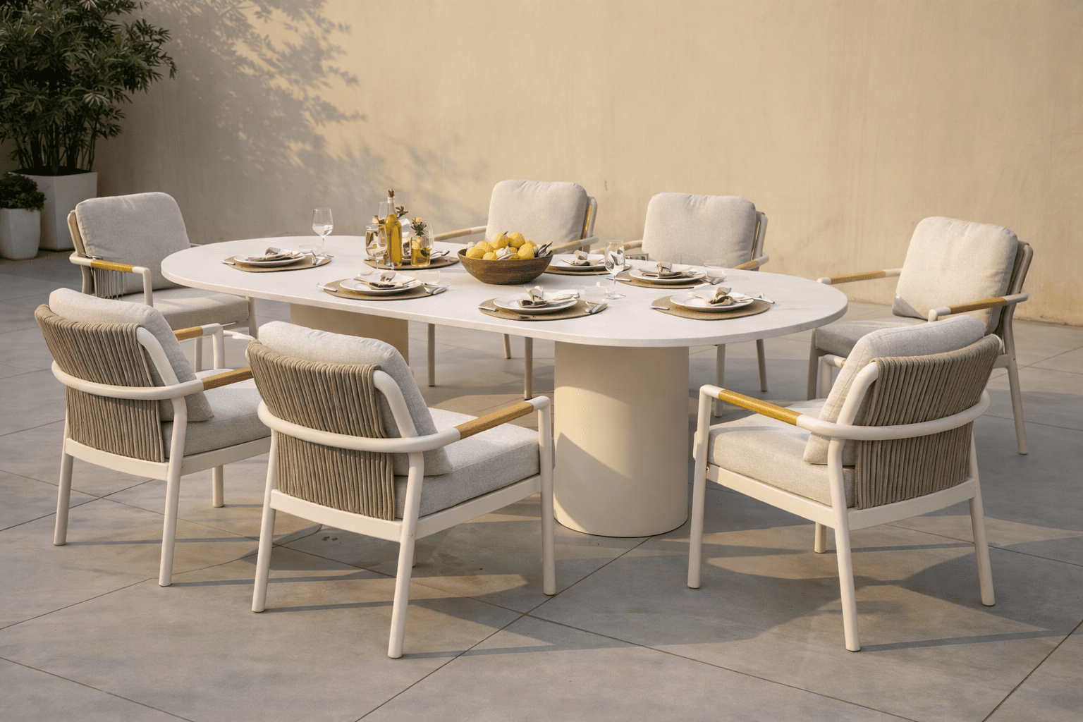 Cambridge table is a special design dining table that can accommodate up to 8 people. It has aluminium white solid frame and sintered stone top in cream colour.