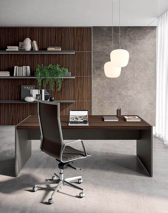 This line is a dynamic and versatile interpretation of the X9, with the addition of a panel leg that enhances executive rooms of all sizes. The veneered wooden surface can be decorated with leather inlays for a sensation of refined softness to the eye and to the touch. Available in different configurations and sizes, the model with writing desk comes with a chest of drawers and additional functional accessories. The collection creates contemporary looks thanks to multiple finishing options for the desk surface and the leg panel, including anthracite-colored melamine, exalting the uniqueness of every executive style. Also, available in the meeting table version, with different size and composition options.