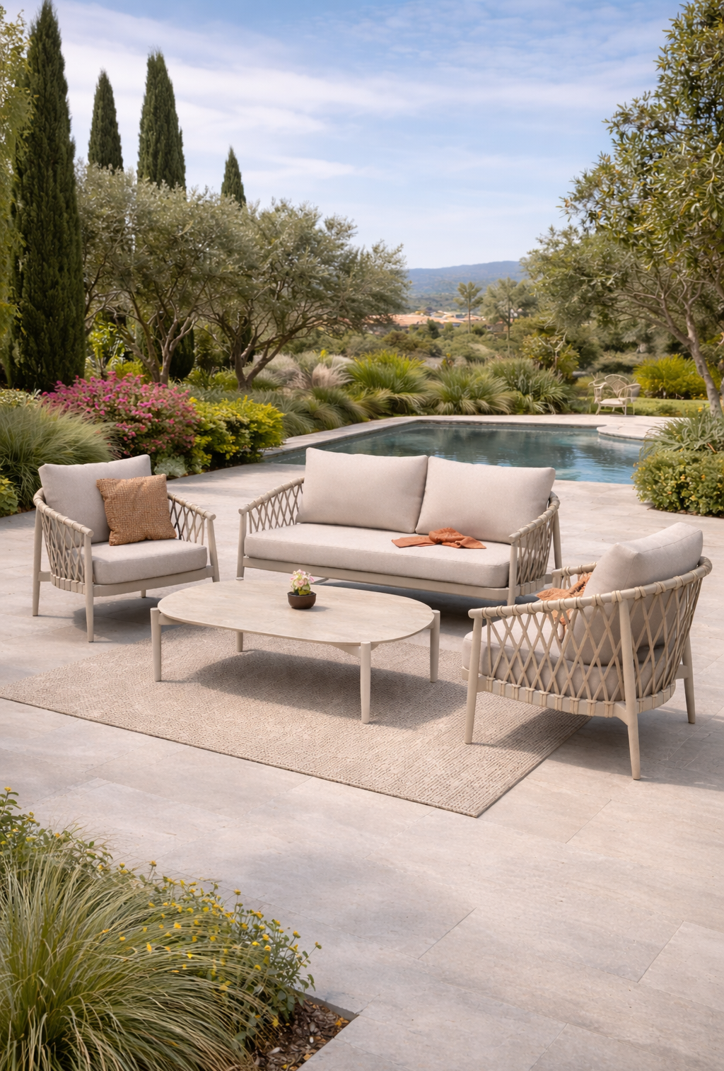 The set includes a coffee table with an aluminium frame and ceramic top, all finished in a soft beige colour that complements any outdoor space.