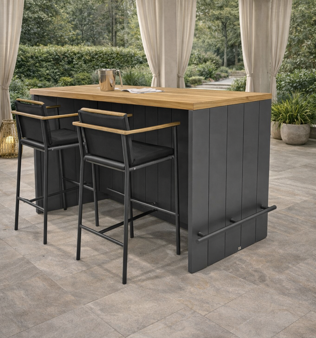Το May Flower είναι ένα ψηλό τραπέζι μπαρ που χρησιμοποιείται για εσωτερική ή εξωτερική χρήση. Είναι κατασκευασμένο από αλουμίνιο σε χρώμα ανθρακί και έχει πάνω μέρος από ξύλο τικ. Έτσι, είναι πρακτικό, κομψό και μοντέρνο. Αναβαθμίστε την εμπειρία σας στην ύπαιθρο με τα ψηλά τραπέζια μας – εκεί που το στυλ συναντά τον ήλιο.