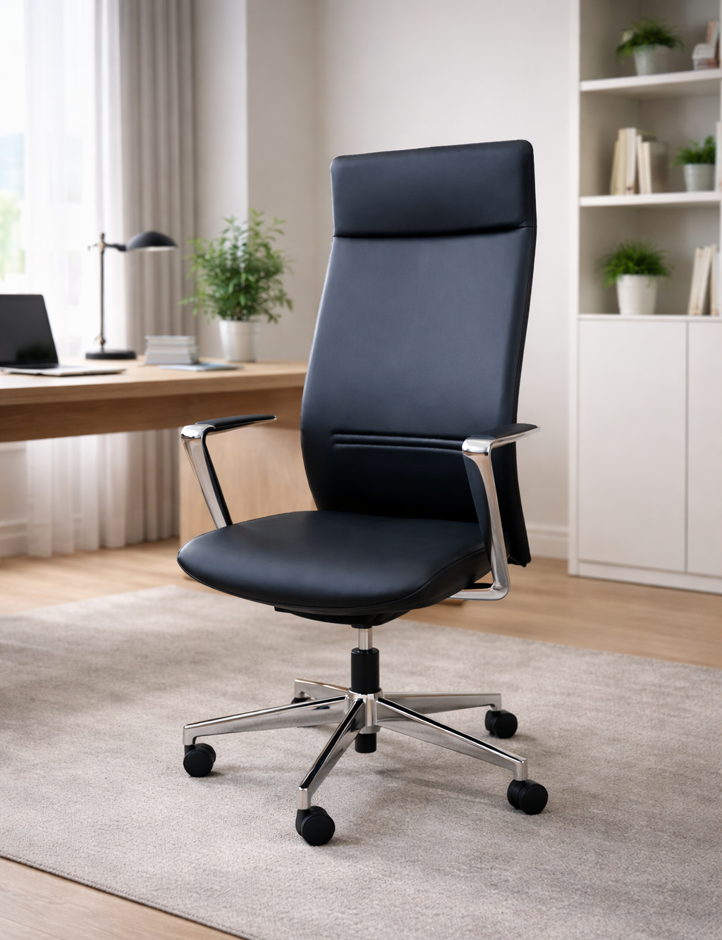 Nolan is a brand new office chair. A minimal design with ergonomic synchro-mechanism with high back in real leather and aluminium base.