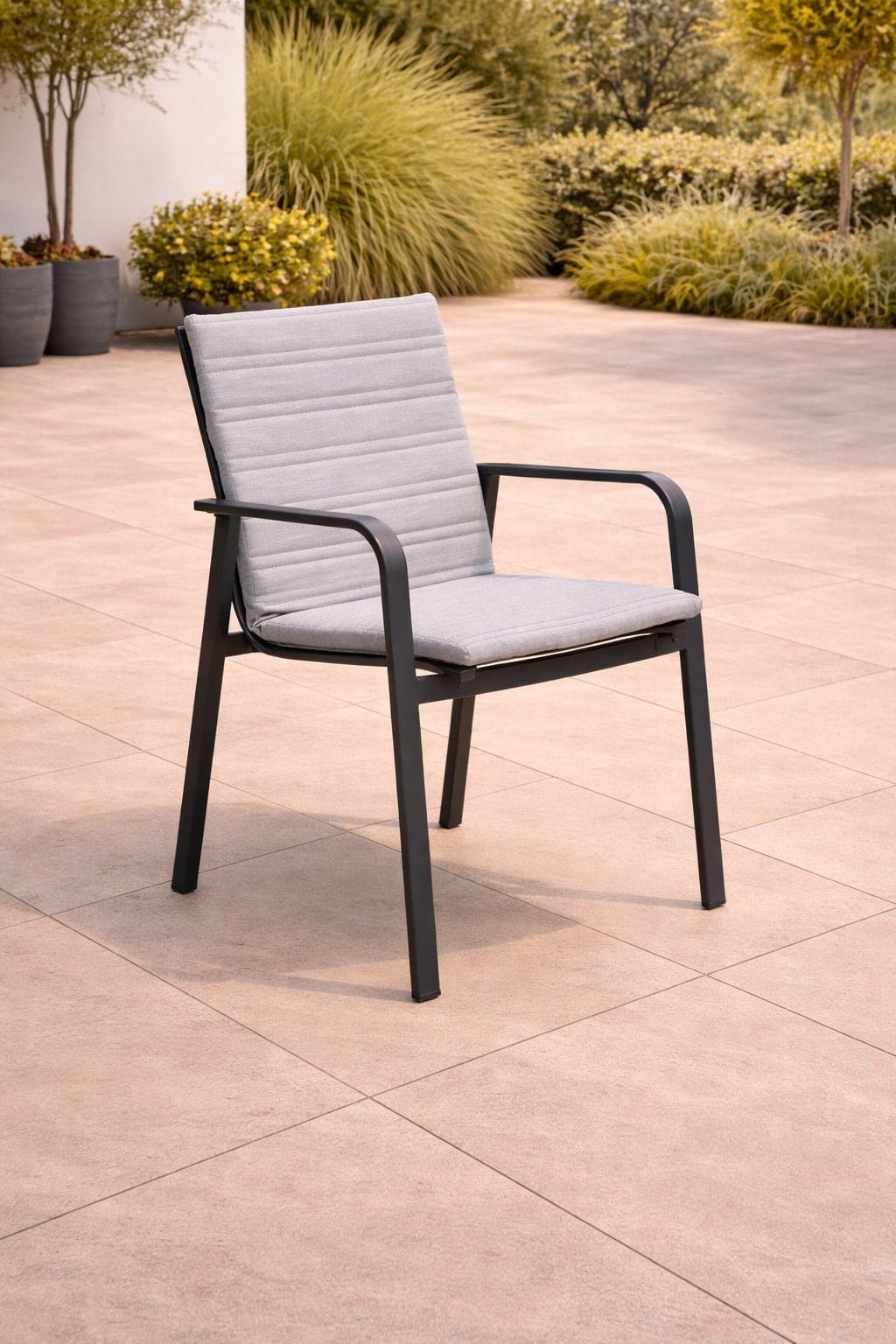 Portofino chair is a versatile product. It consists of full mesh back and seat with aluminium frame in anthracite or white colour and teak wood on the arms. However, it also has a water-repellent pillow for even more comfort. The pillow can be clipped behind the back for stability. Thus, you simply sit and relax!