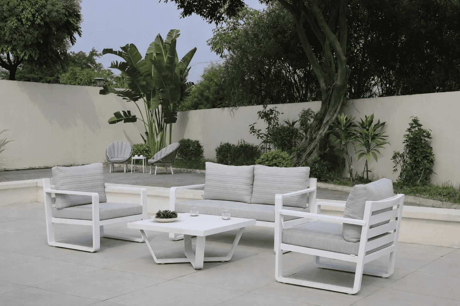 Το σετ καναπέ Portofino έχει να κάνει με την άνεση. Αποτελείται από μονές πολυθρόνες, διθέσεους καναπέδες, τριθέσεους και χαμηλό τραπεζάκι σε τετράγωνο από αλουμίνιο και τικ ξύλο ή ορθογώνιο αλουμίνιο. Είναι φτιαγμένο από αλουμίνιο σκελετό σε λευκό ή ανθρακί χρώμα με άνετα μαξιλάρια σε χρώμα ανοιχτό γκρι και με ξυλάκι τικ στα χέρια του καναπέ. Το αλουμίνιο έχει πολλά πλεονεκτήματα όπως: ανθεκτικότητα, ελαφρύ, αντοχή στη διάβρωση, πυρασφάλεια, ανακυκλωσιμότητα και ελάχιστη συντήρηση. Επομένως, απλά κάθεστε και χαλαρώνετε!