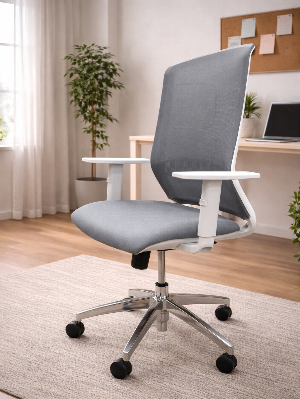 Εργονομική καρέκλα γραφείου χωρίς προσκέφαλο, με πλάτη από δίχτυ και επενδυμένο κάθισμα. Το σχήμα της πλάτης καθιστά δυναμικό και ελκυστικό το μοντέλο καρέκλας. Είναι ιδανική για μοντέρνα γραφεία στη δουλειά ή και σε σπίτι.
