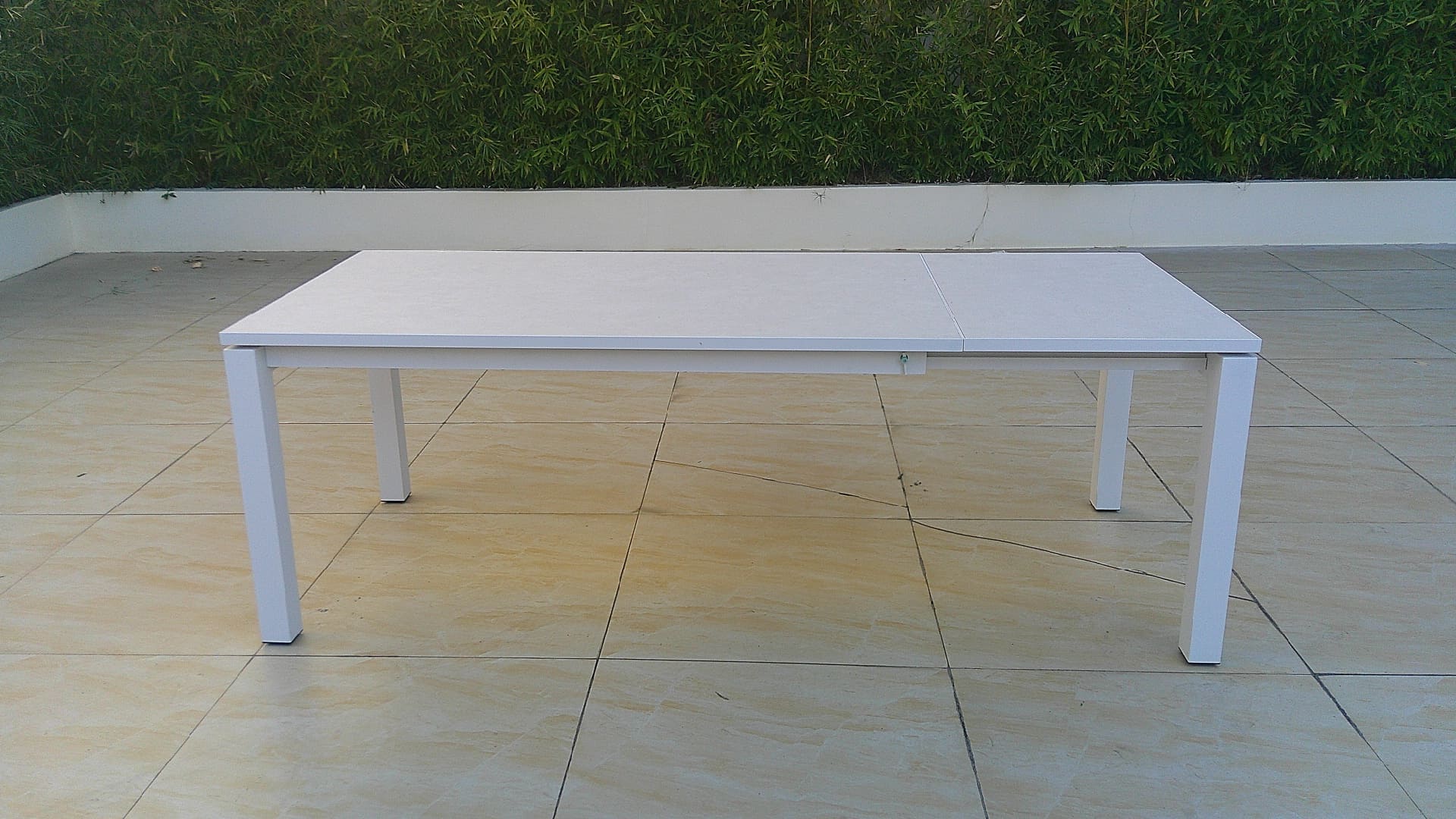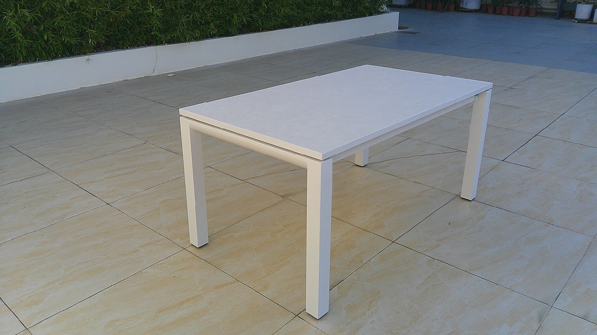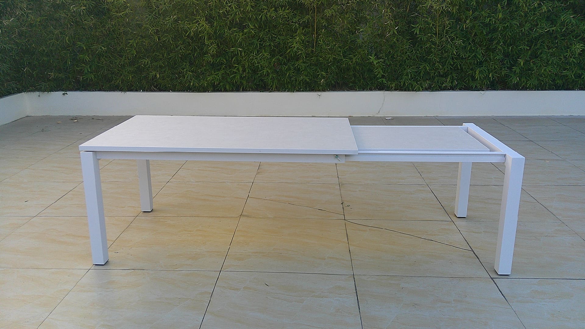 Texas is a rectangular extendable table that offers flexible dining for both indoor and outdoor spaces. It has aluminium white frame and sintered stone top in cream colour. Its minimalist design expands easily to accommodate extra guests while maintaining a clean, modern look when closed. Crafted from durable, weather-resistant materials, it delivers long-lasting performance with effortless style for everyday use and entertaining.