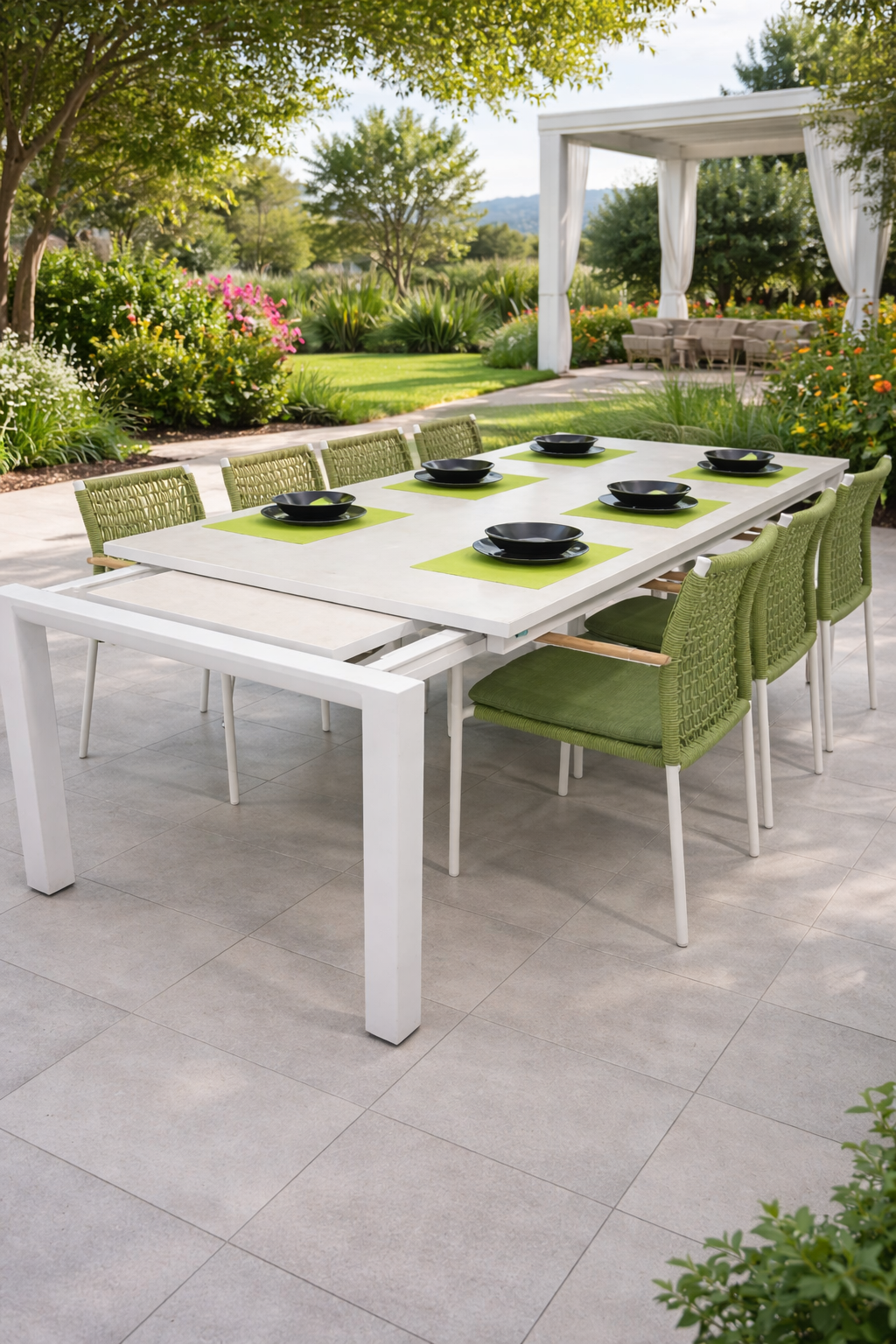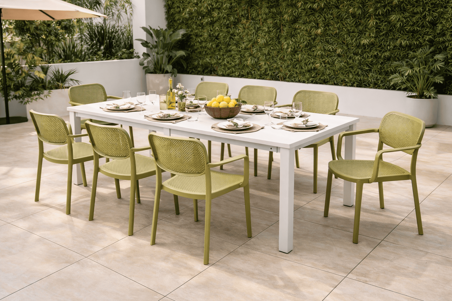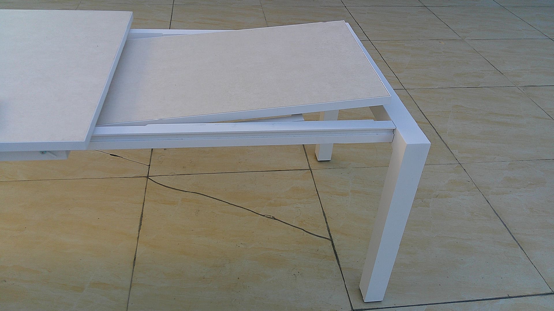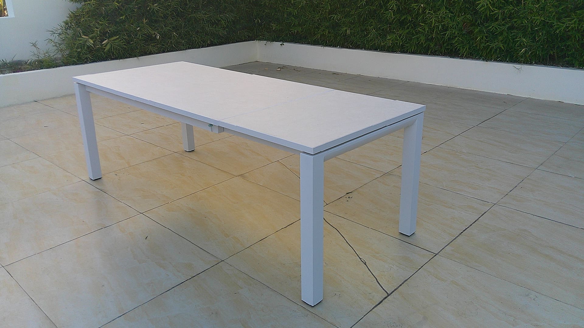 Texas is a rectangular extendable table that offers flexible dining for both indoor and outdoor spaces. It has aluminium white frame and sintered stone top in cream colour. Its minimalist design expands easily to accommodate extra guests while maintaining a clean, modern look when closed. Crafted from durable, weather-resistant materials, it delivers long-lasting performance with effortless style for everyday use and entertaining.