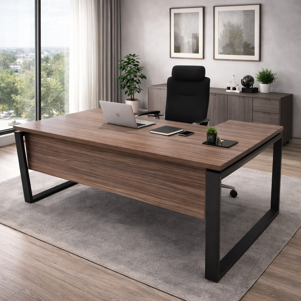 Metal ring leg desk and conference systems in white or anthracite colour. Assembled with melamine top, modesty panel and/or drawer to create a professional, modern office desk