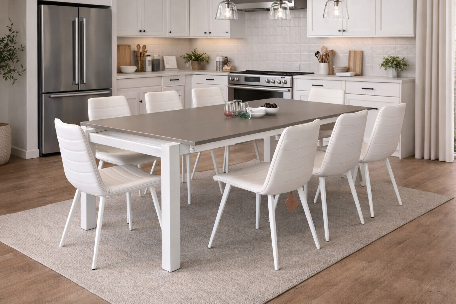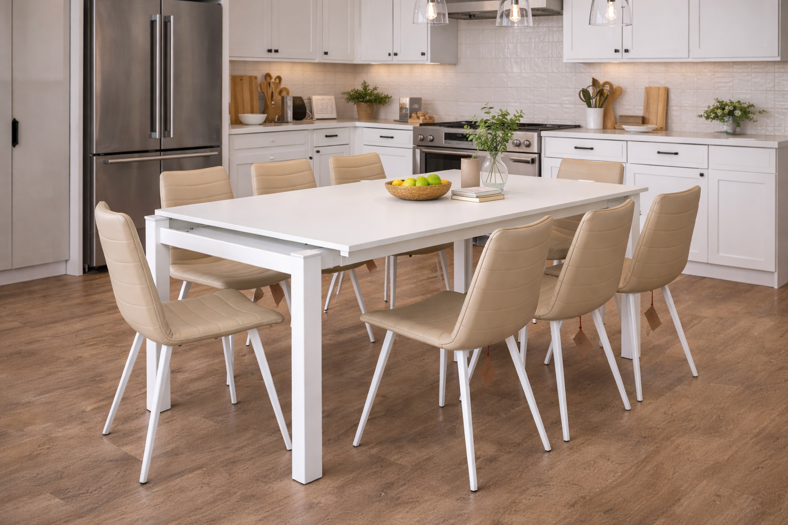 Badu extendable table with white metal frame and top in melamine in white or sand colour. Dimensions: 90×140/200cm. From 6 to 8 people