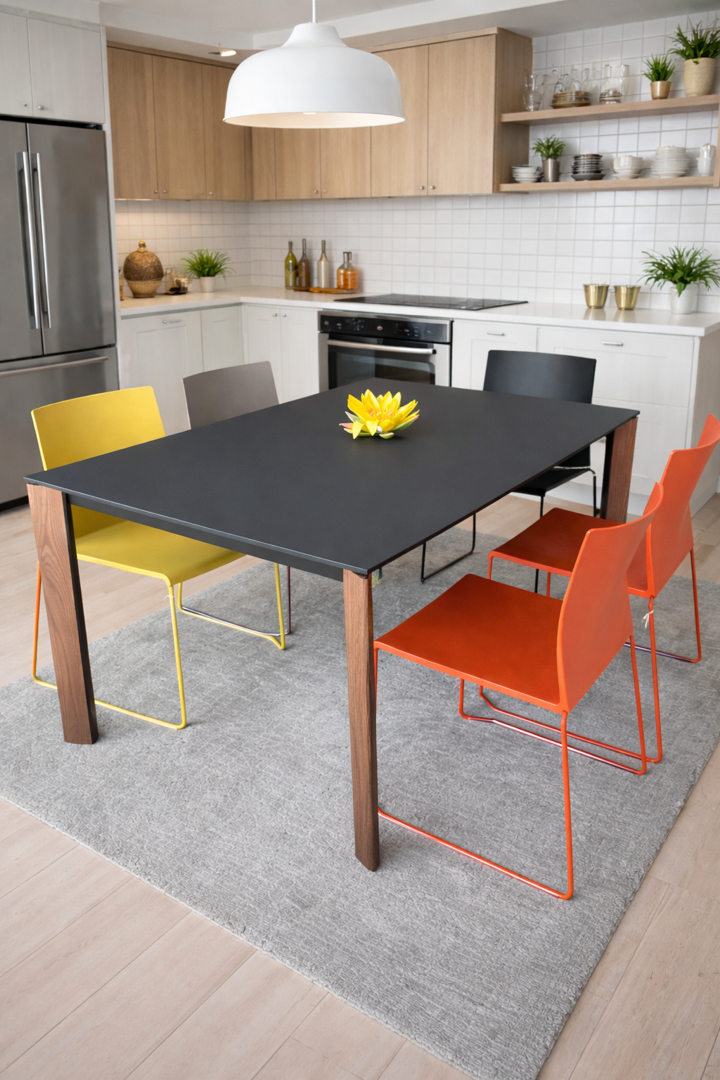 Blade extendable table with veneered wood legs and black metal frame + Top in black Fenix Dimensions: 90×140/200cm Artesia chair in painted frame and polypropylene seat