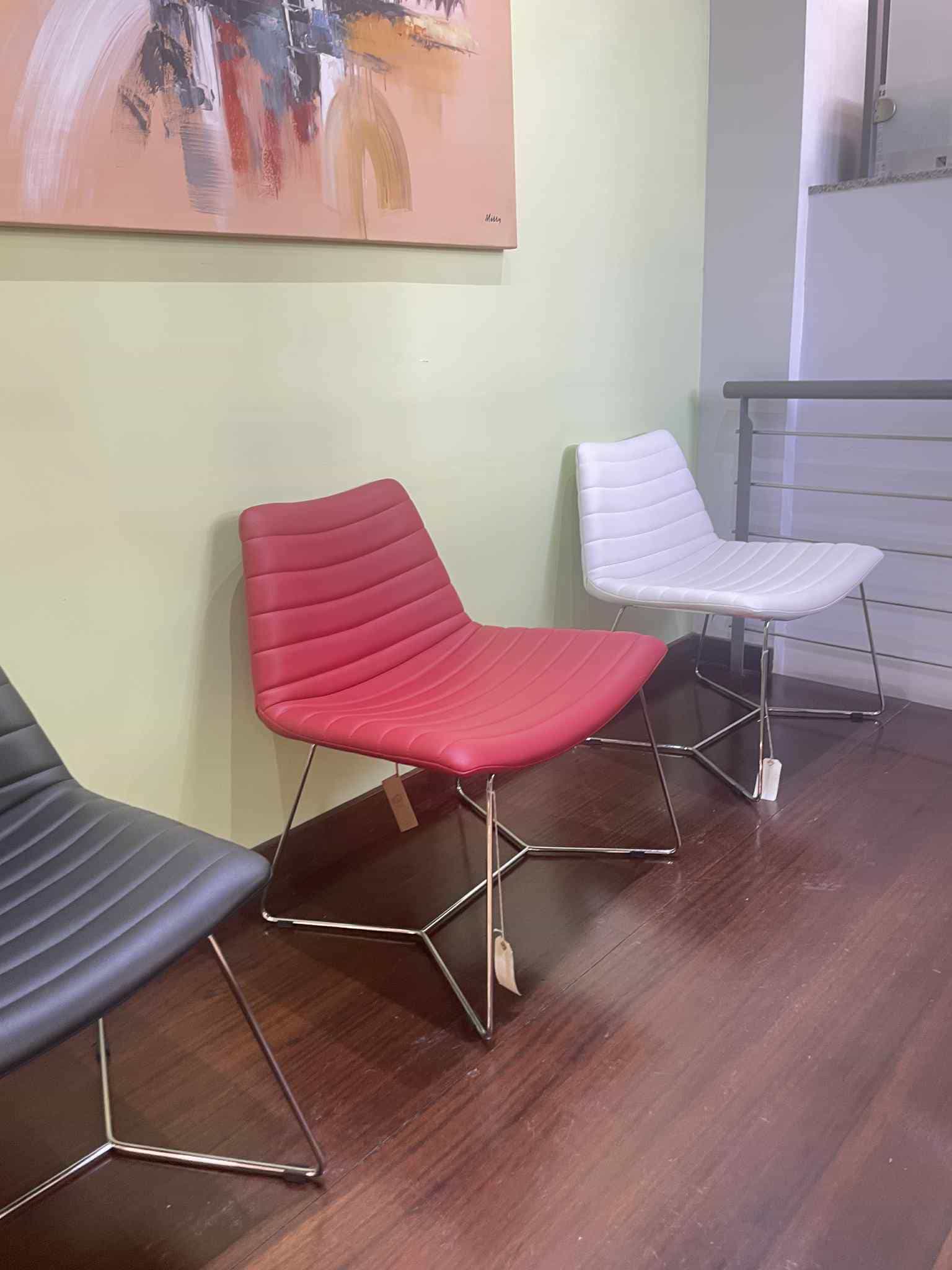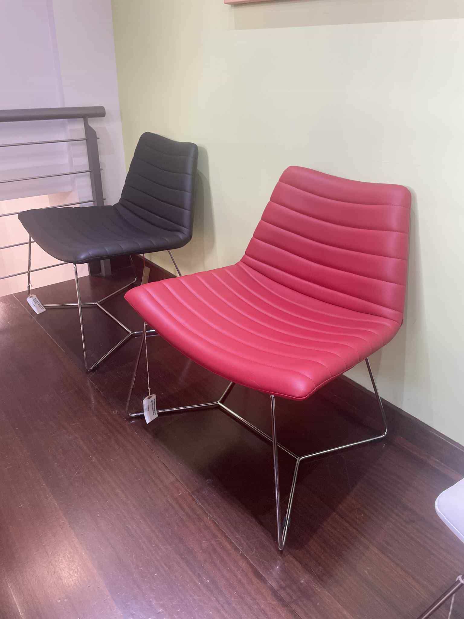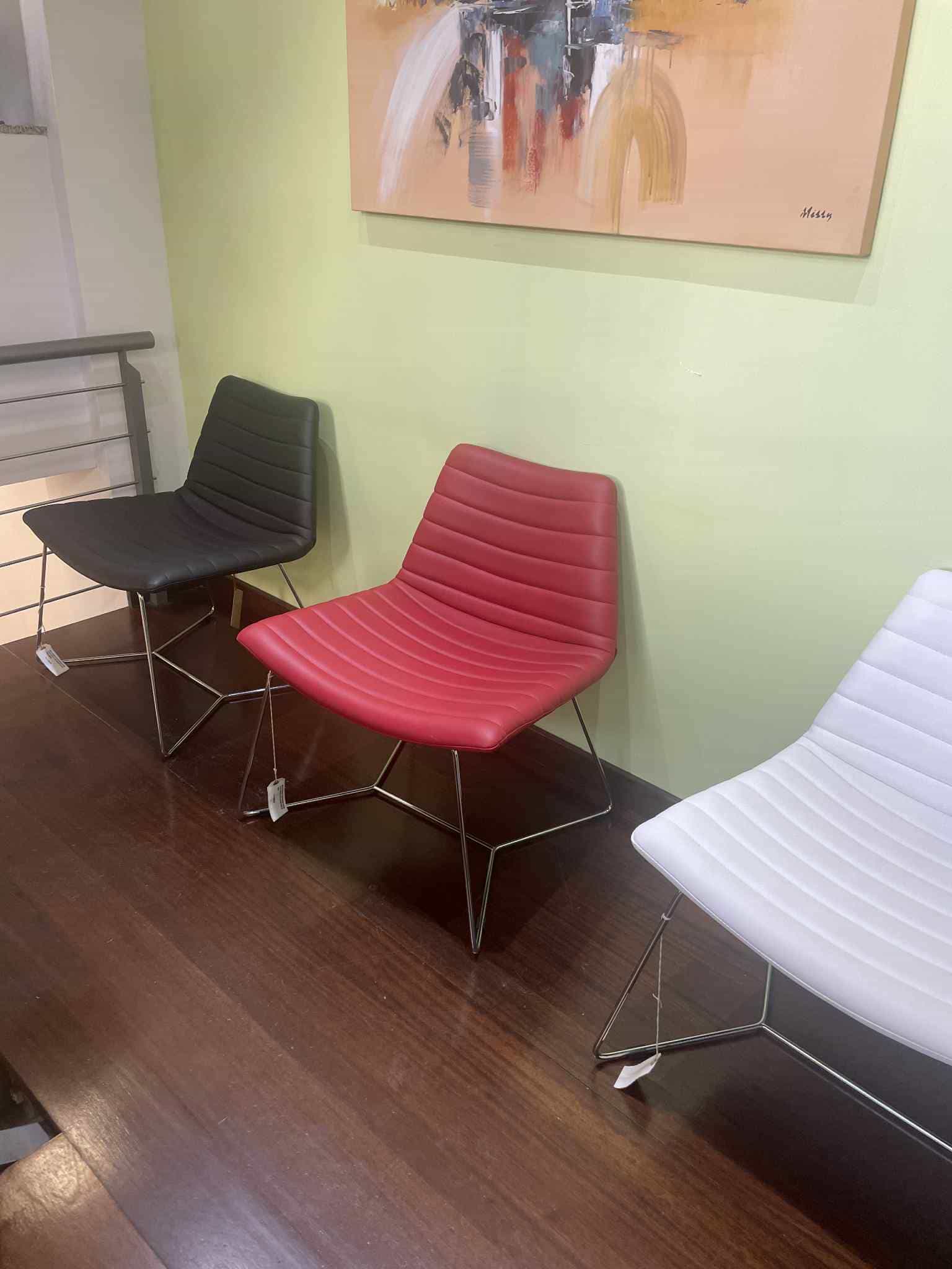 Lounge chairs with chromed metal frame and secret leather seat in white, black or red colour.