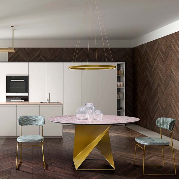 Cube is elegant, harmonious and sophisticated. It combines an incredibly original and modern base formed by a single bended metal sheet, which is also available in veneered. Cube can be made from different materials, such as expertly molded metal. Thus, this highlights a dynamic design and adds movement to the table. Also, wood brings out its timeless beauty and strength that creates a unique piece of design for any environment.