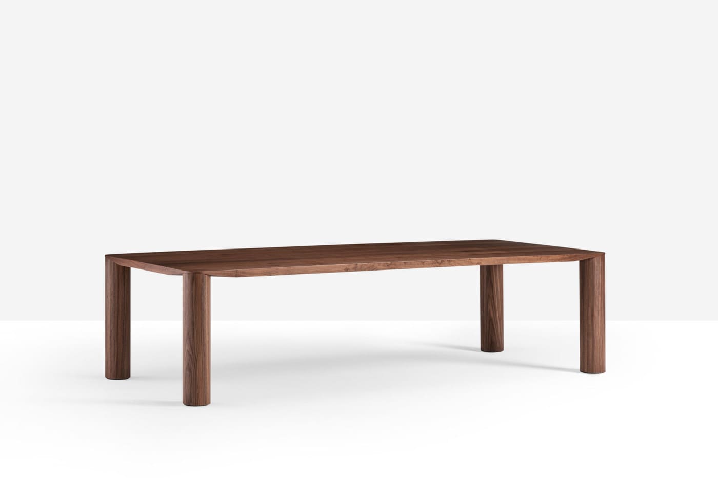 Eggen is a fixed table with a bulky four-legged base and veneered wood structure, configurable with rectangular tops of different dimensions.