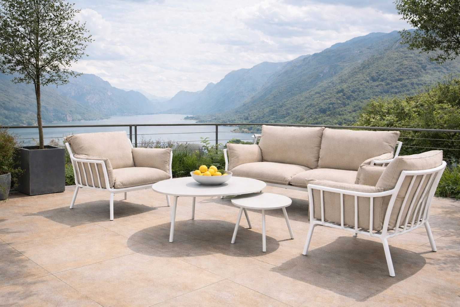 Bring timeless elegance and effortless comfort to your outdoor or indoor living space with the Emma Sofa Set. Designed with a sleek white aluminium frame and beautifully tailored beige cushions, this set blends modern aesthetics with everyday durability.