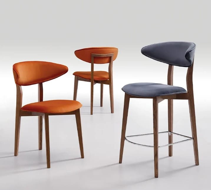 Flare is an exceptional collection of chairs and stools with fine finish of ash wooden base. It can be upholstered in a range of fabric or leatherettes and it is also available in many colours.