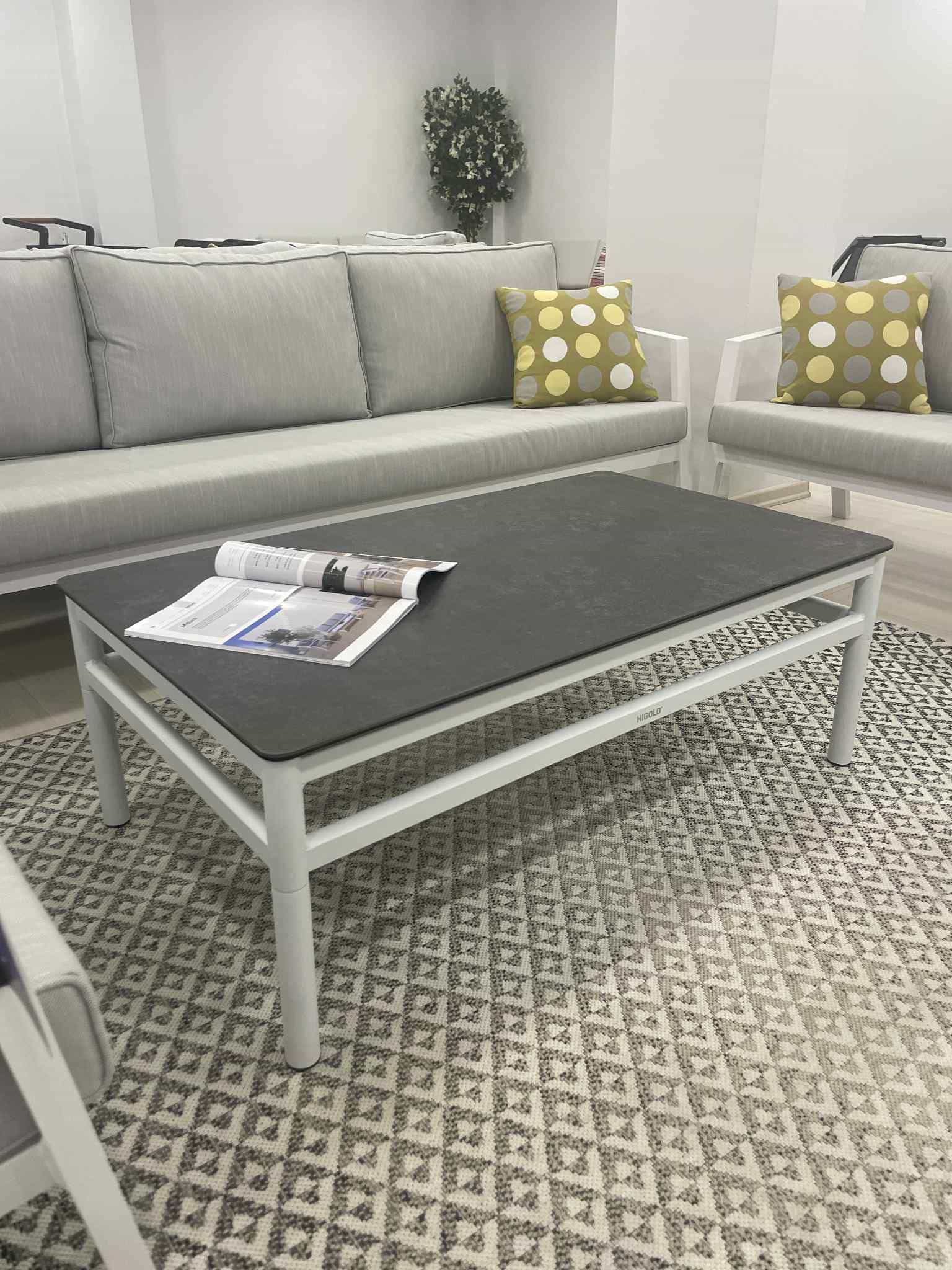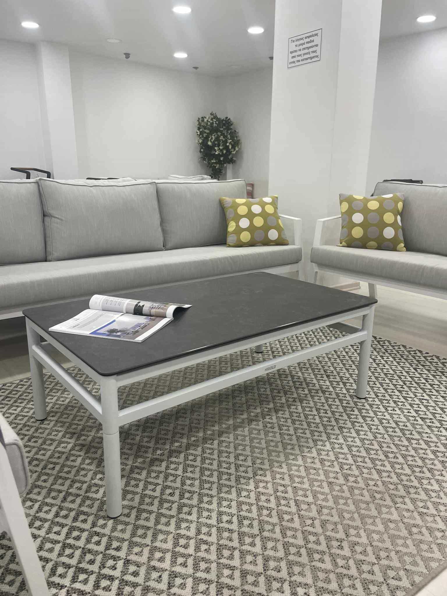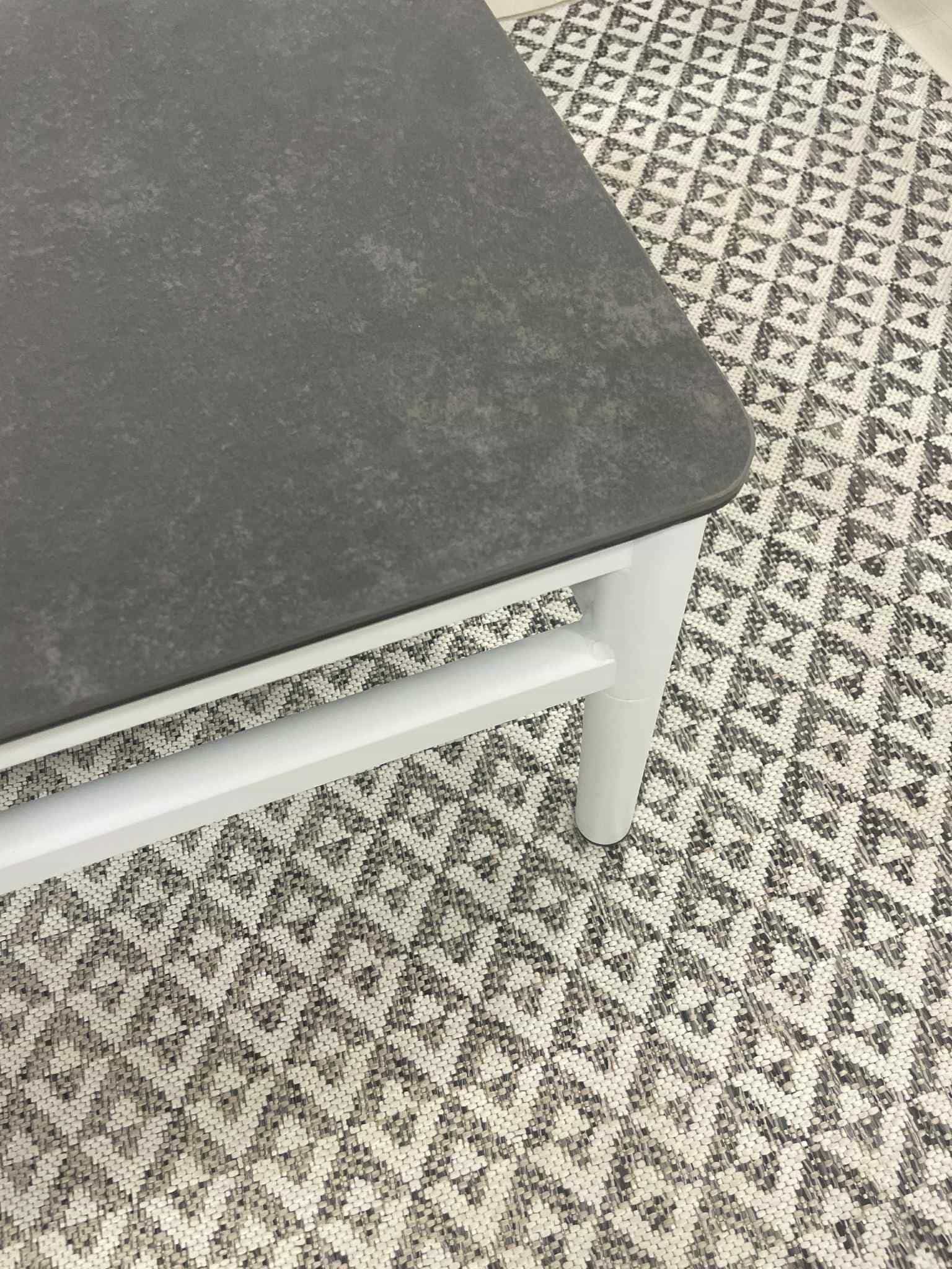 Gloria coffee table has aluminium frame in white colour and ceramic top in dark grey colour. Dimensions: 110x65x40(Height)cm