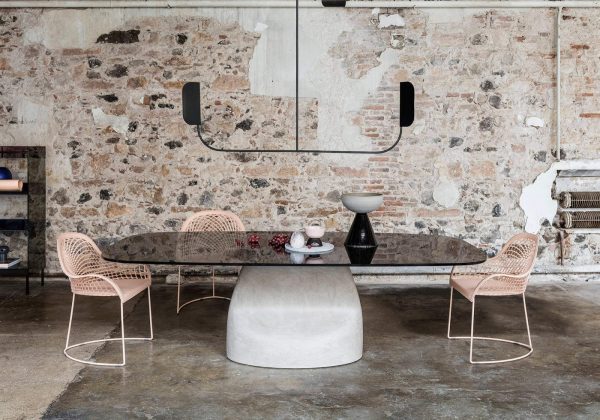 A fixed table with Baydur® base or Baydur® with brushed concrete effect, lacquered steel insert and crystal ceramic rectangular top with rounded corners