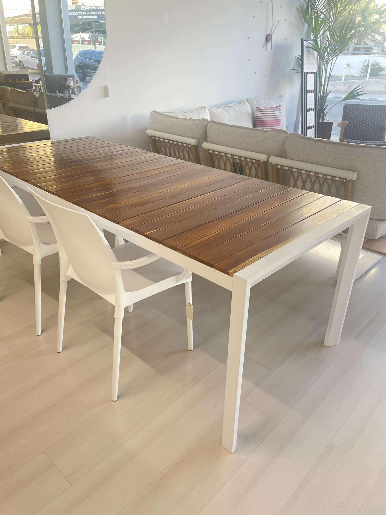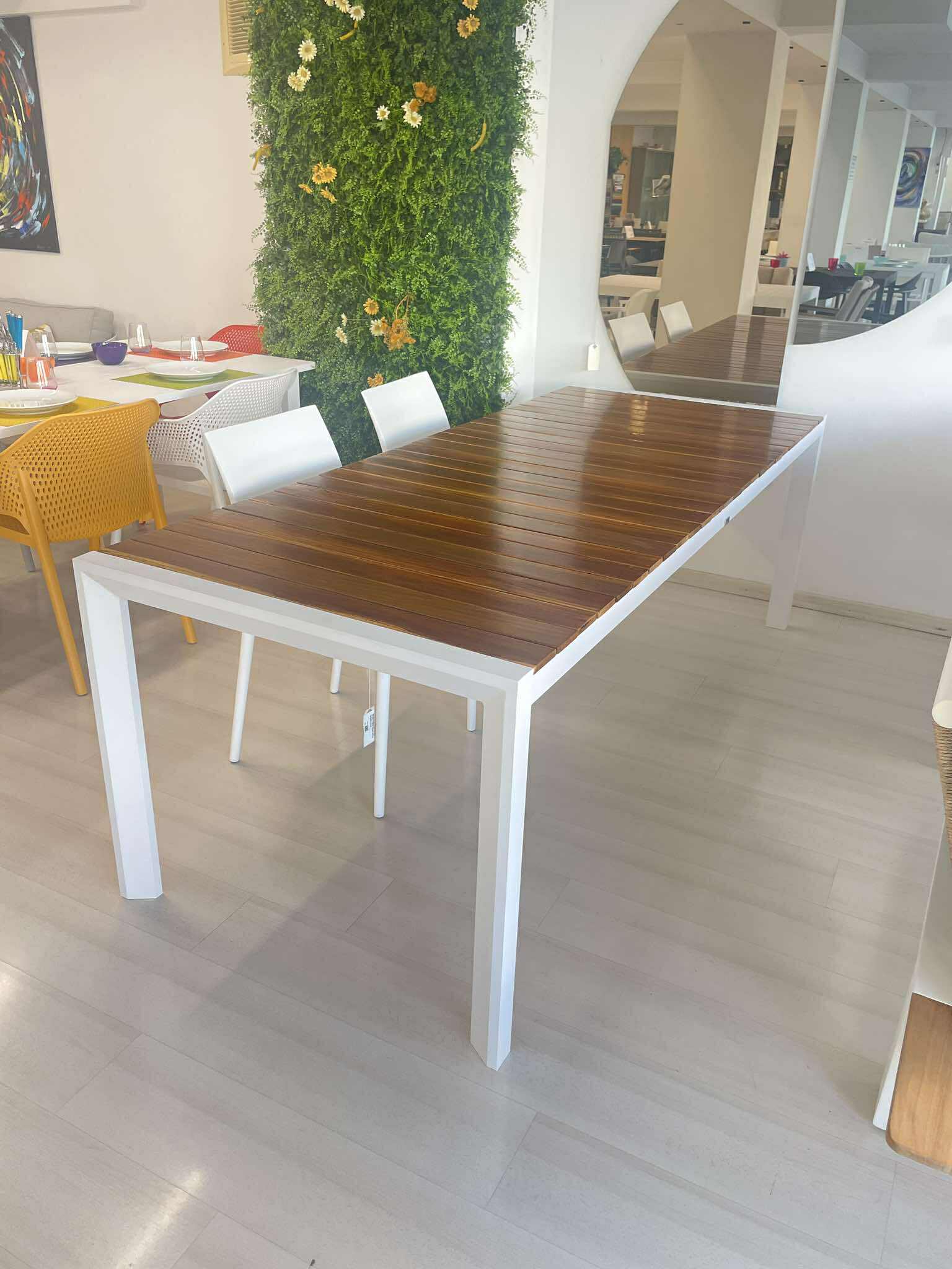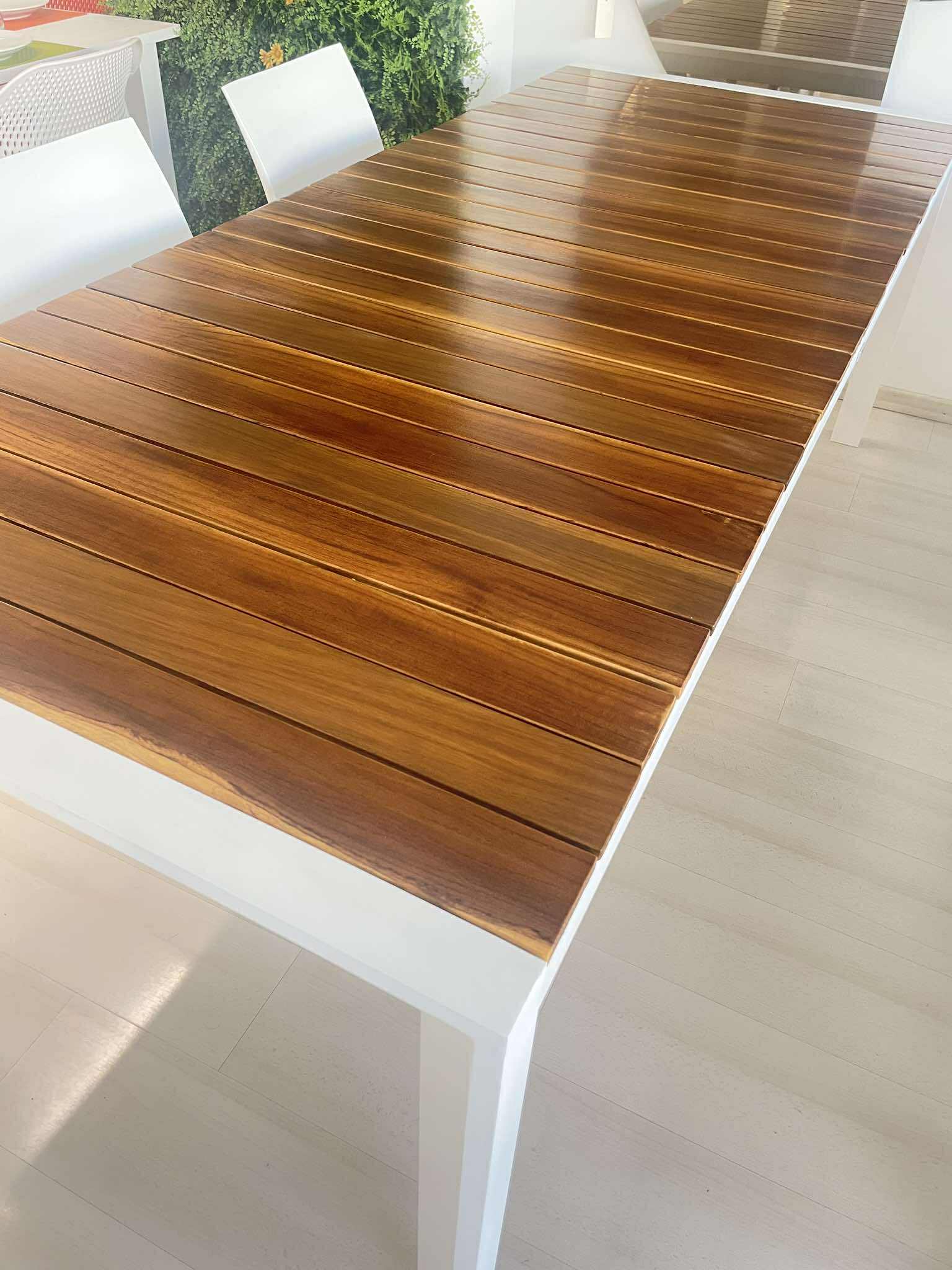 Grawford table has aluminium frame in white colour and teak wood top. It is a fixed table used for both indoor and outdoor use, with dimensions 226 x90 x H75cm.
