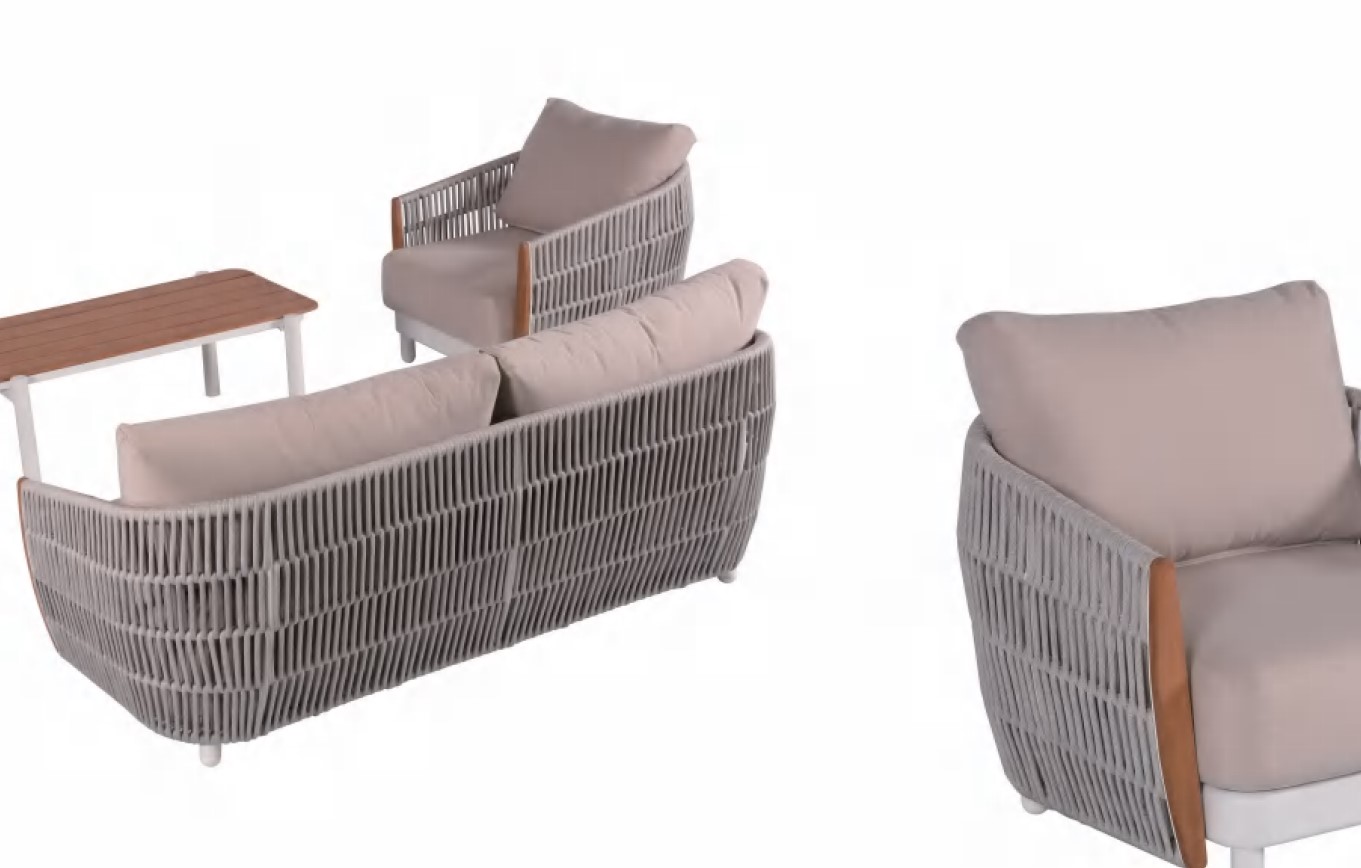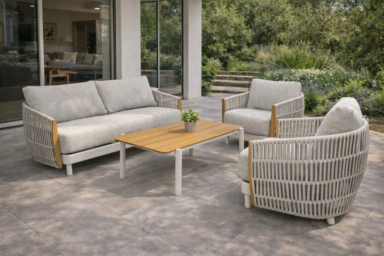 Ivern sofa set is an elegant lounge set that combines modern design with natural accents, creating a warm and inviting outdoor living space. Featuring a durable aluminium frame in a refined neutral finish, the set is complemented by beautifully detailed rope weaving along the backrests for added texture and style.