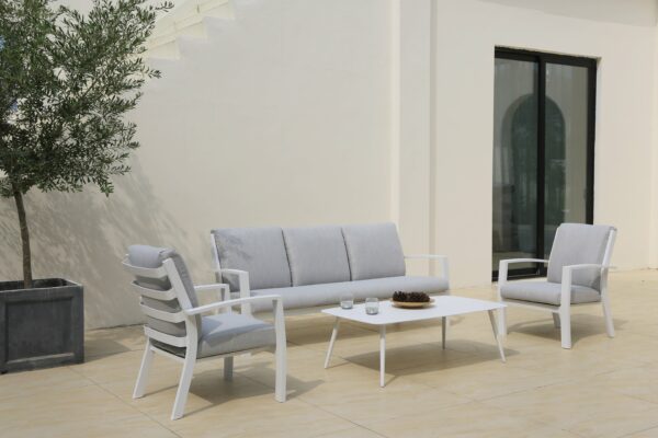 The Midura Chair combines modern design with luxurious comfort, making it perfect for both indoor and outdoor use. It features a sleek white aluminium frame that is lightweight yet sturdy, ensuring durability and style.
