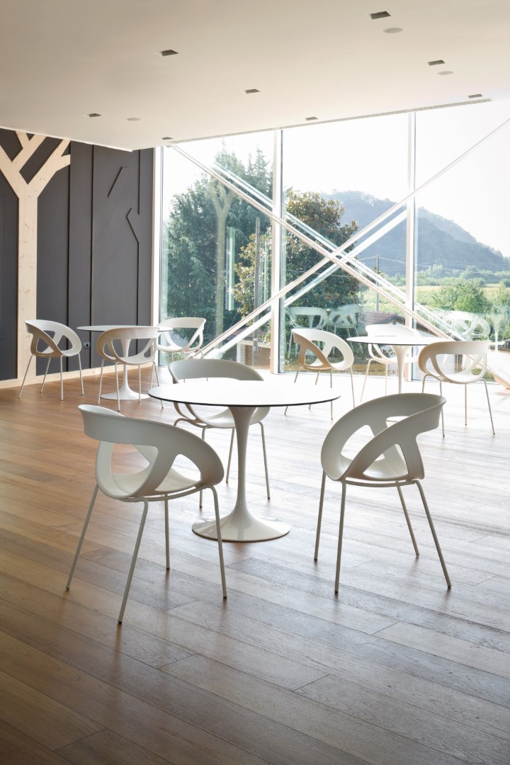 Moema is cozy. Cozy thanks to a simple wrap-around design. The techno-polymer shell, suitable for indoors or out, or the leather upholstered version; wooden, plastic or steel frames make Moema suitable for a multitude of purposes. And Moema is always contemporary, renewable, accessible, stackable, colorful and full of bright finishes