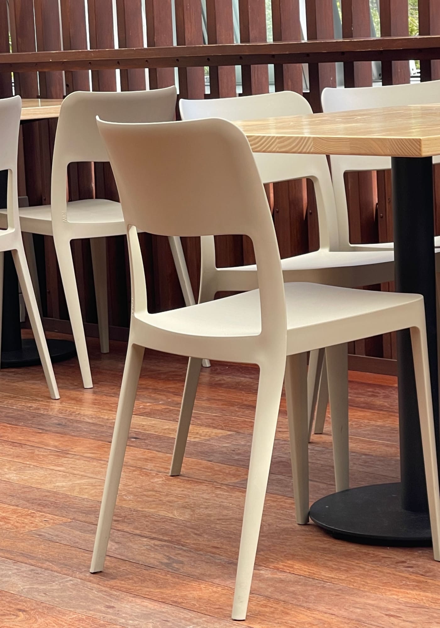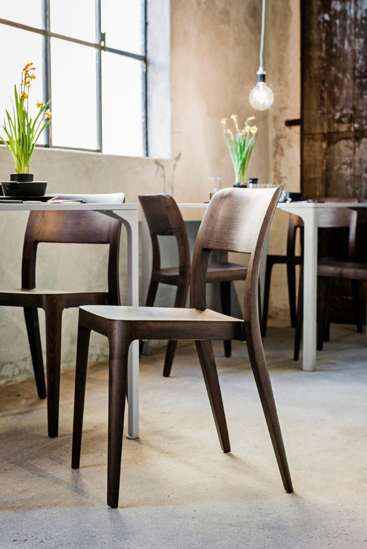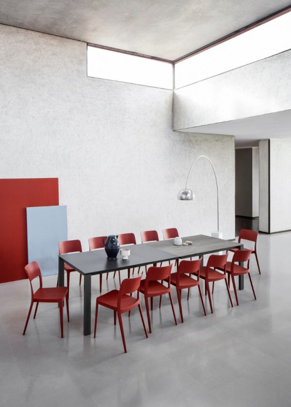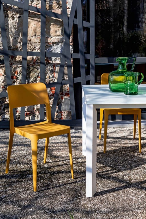 The Nenè collection is based on concepts of efficiency and practicality. The simple shapes of the classic chair led to a new collection characterised by a fresh and contemporary design, applicable for both residential and commercial use, and suitable for indoor and outdoor use as well. Chairs are available with a closed or open backrest, upholstered in plastic, with or without armrests, and removable cover. The plastic versions meet regulatory requirements for use in public places, are stackable and treated to resist UV rays. Nenè’s lightness can also be found in the table collection, suitable for both contract and residential use. Tables are available in different sizes, materials, and finishes, maintaining a fresh and practical design. The version with a square and triangular top can be stacked up to four pieces