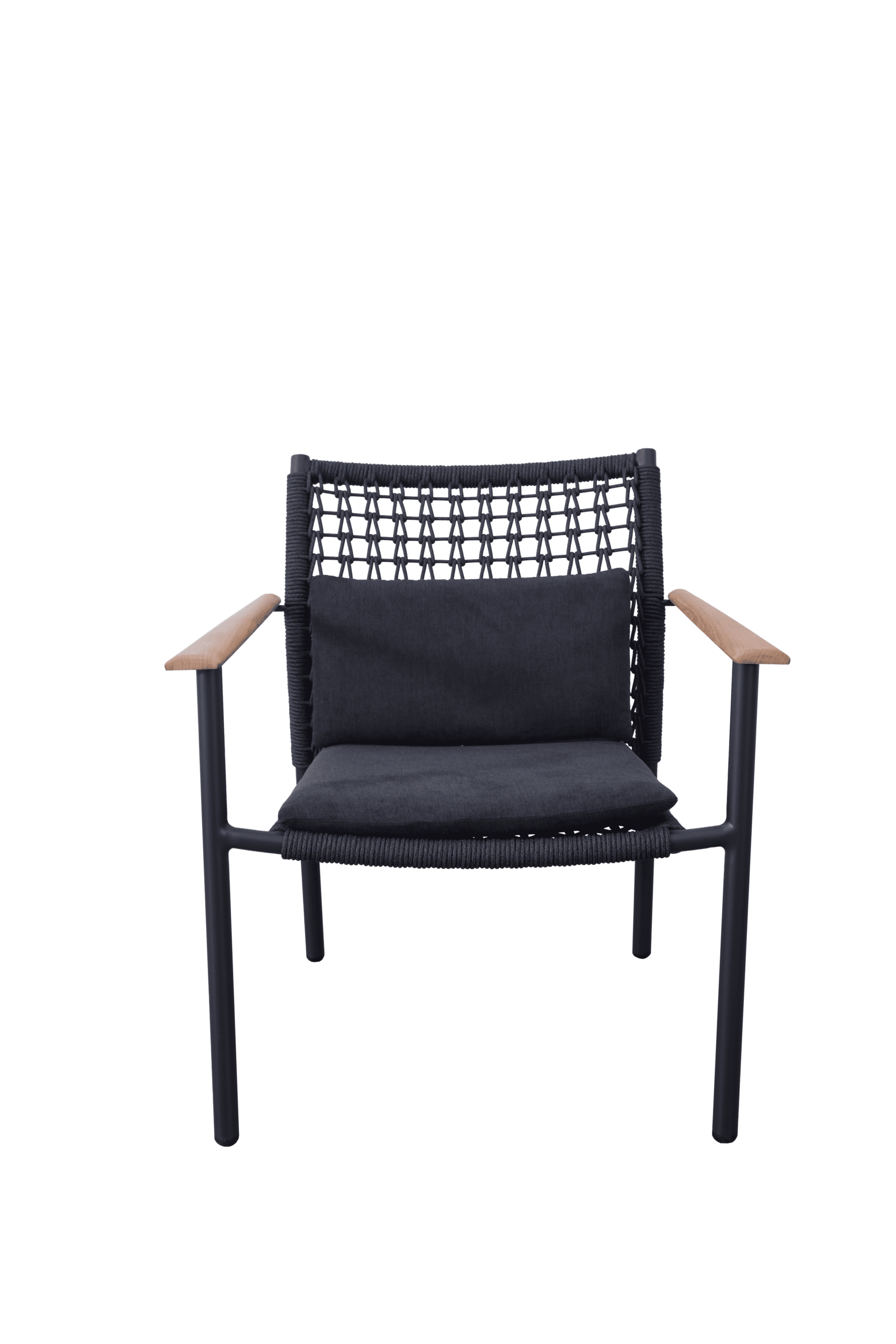 The seat and backrest are woven with weather-resistant rope, delivering a stylish texture and excellent durability against the elements. For added comfort, the seat is equipped with a water-repellent cushion featuring a convenient zip closure for easy cleaning.