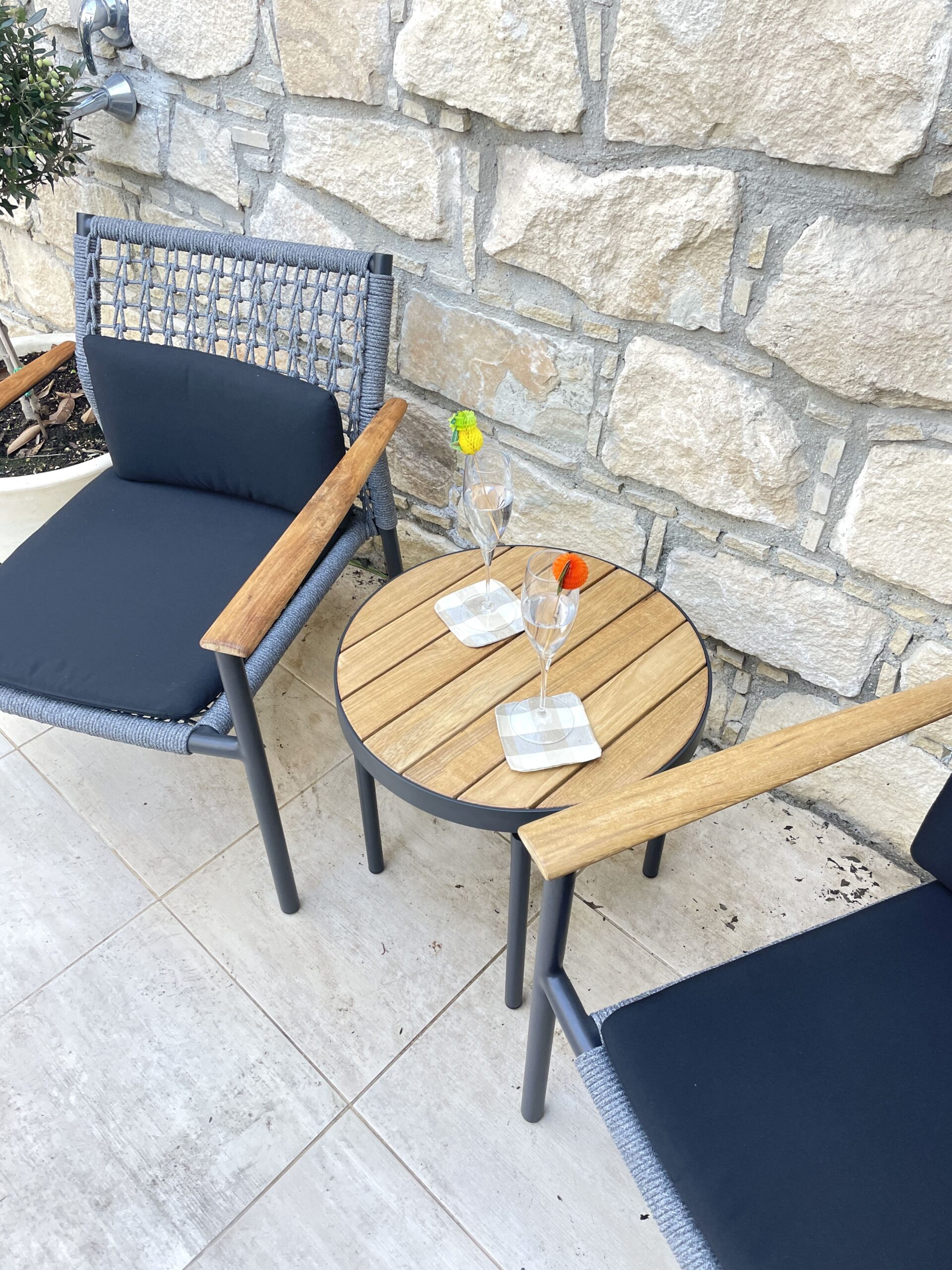 Pavia CT is a coffee table with a black aluminium frame that has a teak wood top. A very minimal design with diameter 50cm and height 50cm.