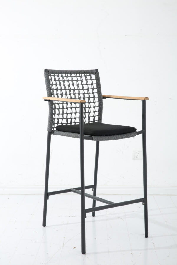 Pavia stool is a brand new model that is available with height 75cm, that can be used for bar tables with height 110-115cm. Its base is aluminium frame in black or white colour, with a weather-resistant rope for seat and back. Of course, there is a complementary cushion for seat as an extra comfort. Also, Pavia stool has teak wood armrests, that add to the natural, earthy look of this stool.