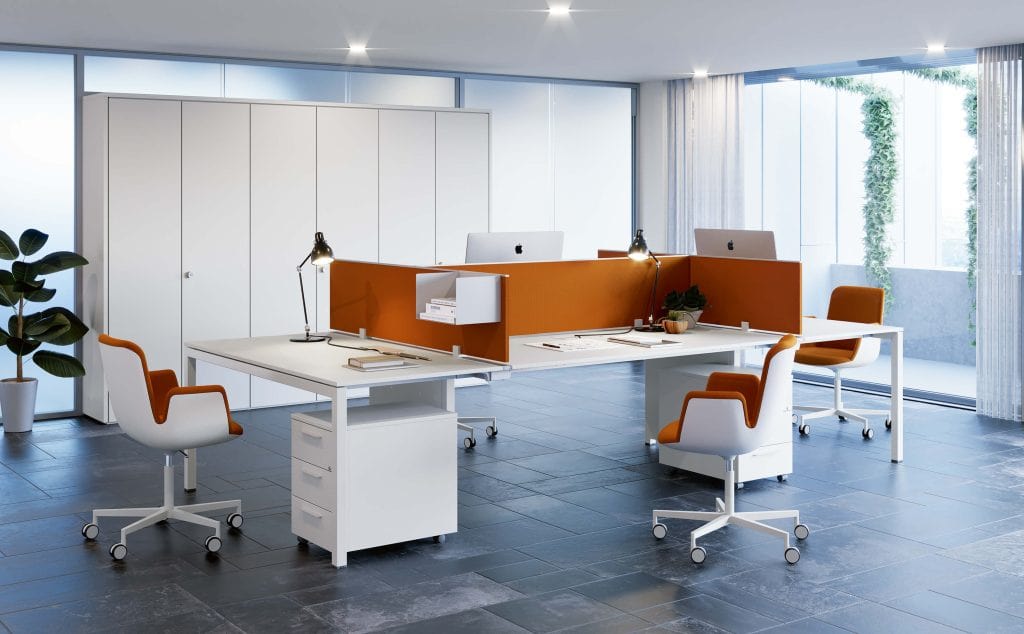 The operative desks, with a depth of 80 cm, are available in the following different lengths 100 – 120 – 140 – 160 – 180 – 200 cm. This offers the possibility to choose the most suitable size for your spaces. The side extensions also allow you to extend the working surface. Operative islands connected to service furniture used as archives and supporting elements, give the environment in which they are inserted a productive and dynamic working atmosphere. The load-bearing service cabinets, that can be 120 and 165 cm long, not only allow easy accessible storage, but also a complete electrification of the workstation, totally hidden inside the technical compartment.