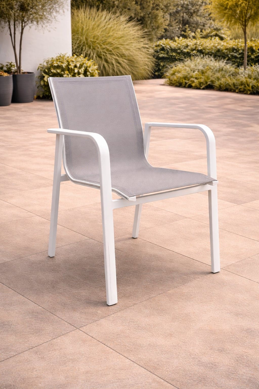 Rainbow chair is with white aluminium frame and taupe mesh for backrest