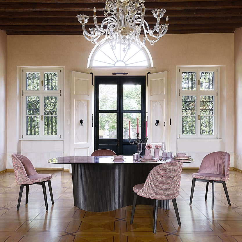 A delicate elegance distinguishes this velvet armchair. The curved backrest, embellished on the front by vertical folds in the fabric, also wraps the seat on the sides, inviting maximum relaxation. Three different wooden and one metal bases are available