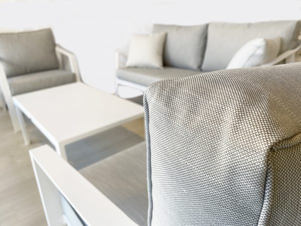 Rosehill sofa set is all about comfort and coziness. It is available in white and anthracite colour. It consists of 1-seat sofa, one 2-seat sofa, 3-seat sofa and a rectangular aluminium coffee table. Rosehill has aluminium frame with easy clean, comfortable light grey cushions. Aluminium has plenty of benefits such as: durability, light-weight, corrosive resistance, fire safety, recyclability and minimal maintenance. Therefore, you simply sit and relax!