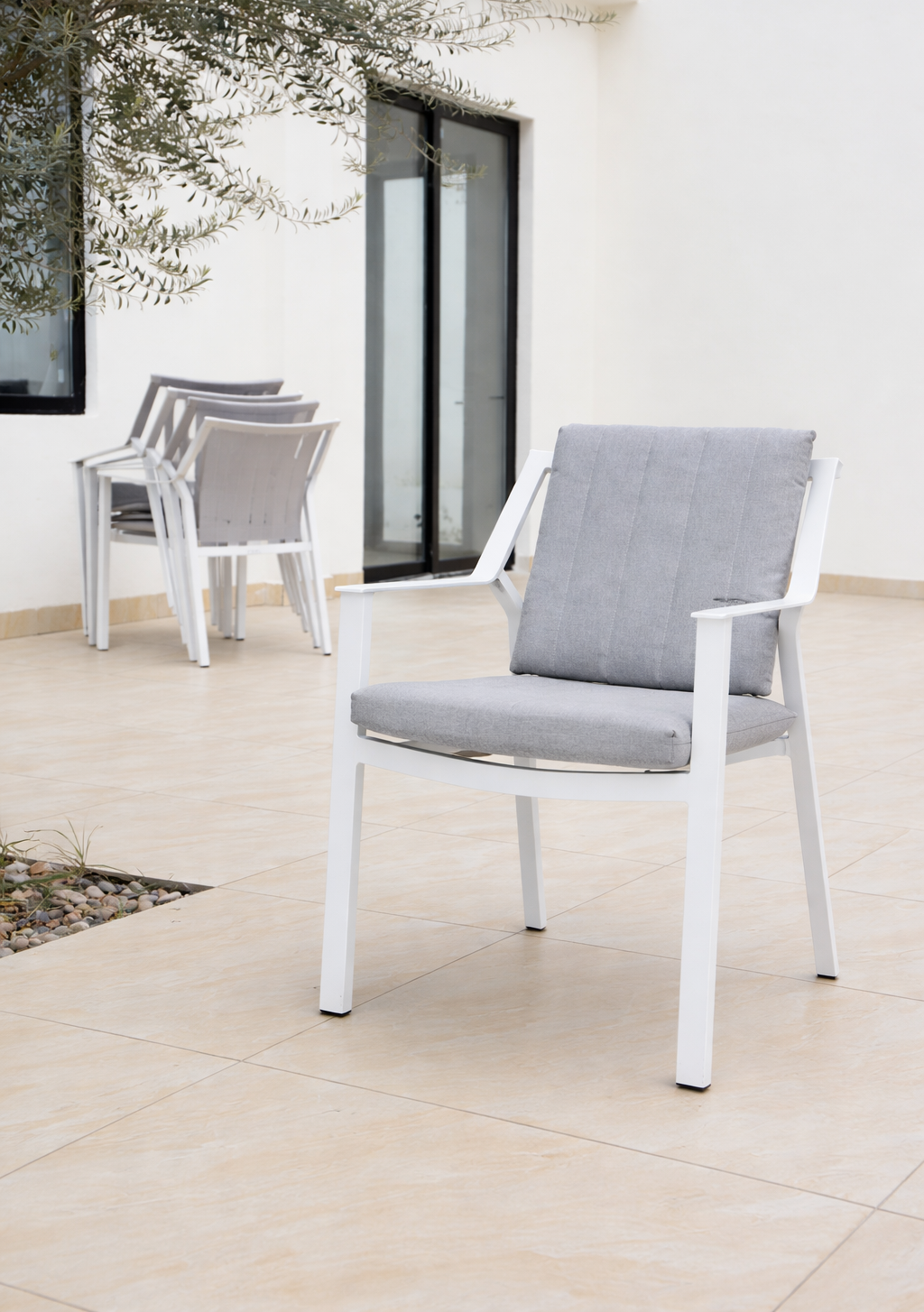 Rosehill chair is the new comfort. It has aluminium frame with easy clean, comfortable light grey cushions. Aluminium has plenty of benefits such as: durability, light-weight, corrosive resistance, fire safety, recyclability and minimal maintenance. Therefore, you simply sit and relax!