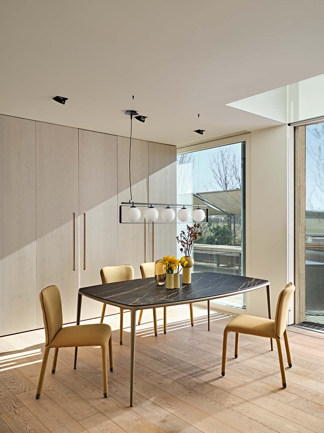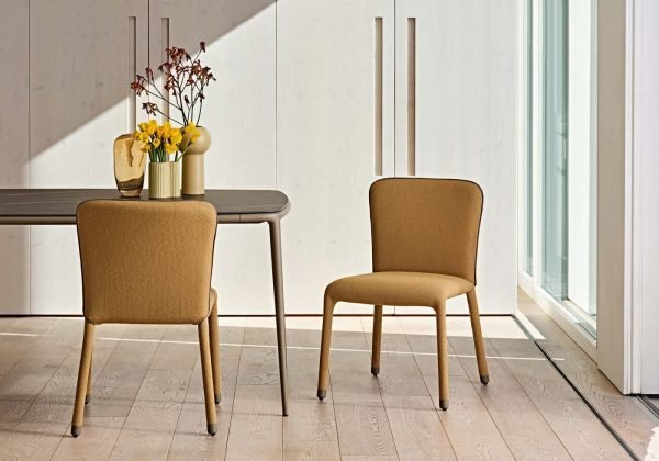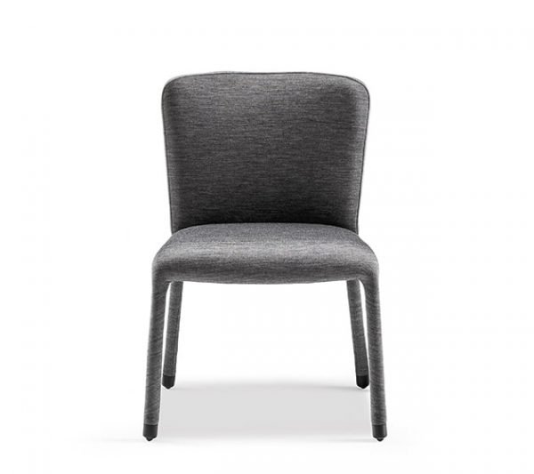 Light and dynamic, it is characterized by a continuous and harmonious line, which elegantly unites all its parts. Sinuously defined curves characterize the entire design. The backrest has a delicately enveloping shape, which widens at the top, to offer adequate support to the back and shoulders. The seat, is also ergonomic, bending forward to smoothly join the legs, avoiding sharp edges and corners. An aesthetic quirk, and a connotating detail, is the external seam of the backrest upholstery. The piping follows the upper profile of the shell and runs sideways to embrace the leg, adding a sophisticated touch.