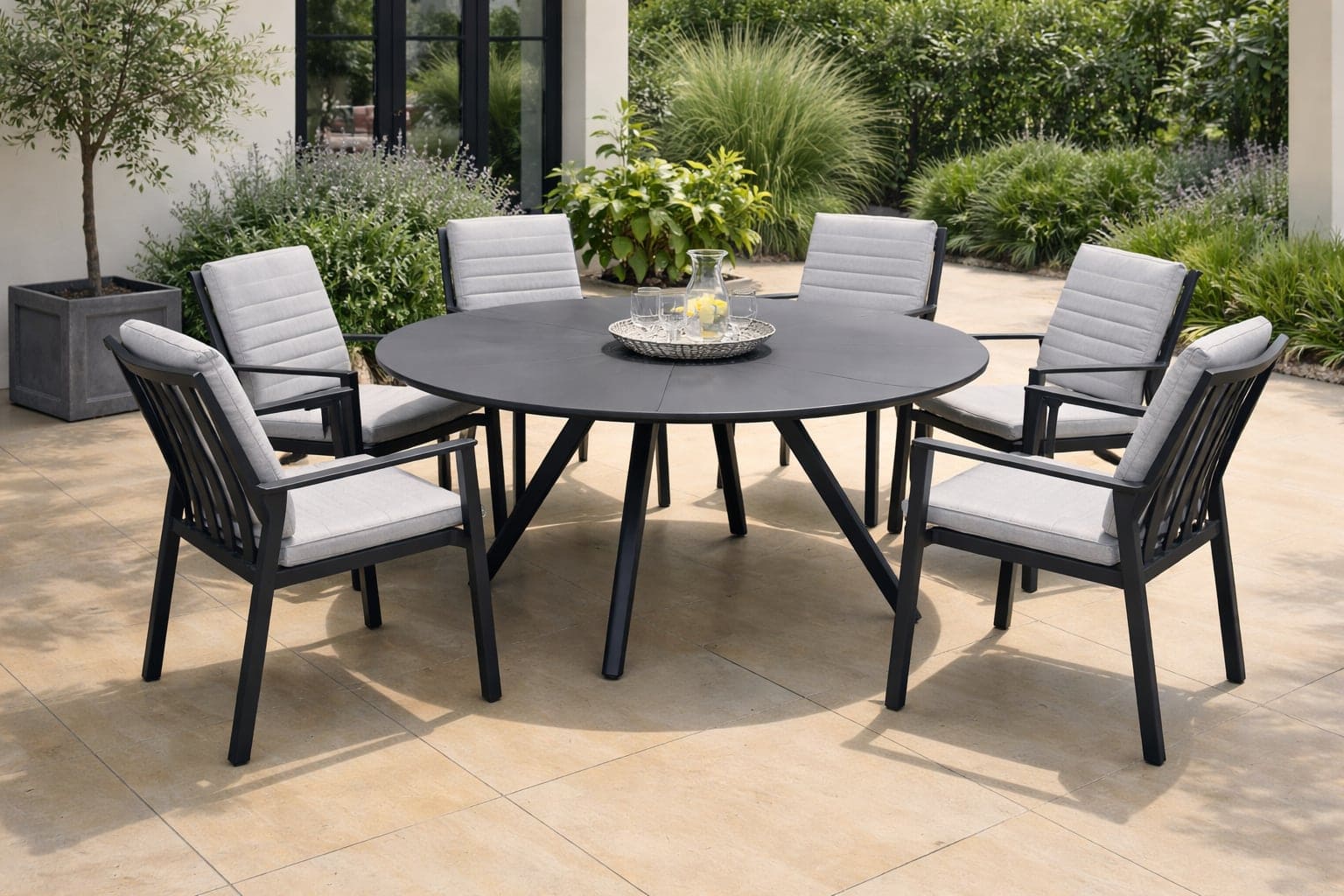 The Seven Round Table brings elegance and functionality to your outdoor space. With a 150 cm diameter and a sleek aluminium frame, available in white or anthracite, it’s designed to foster interaction and create a welcoming atmosphere.
