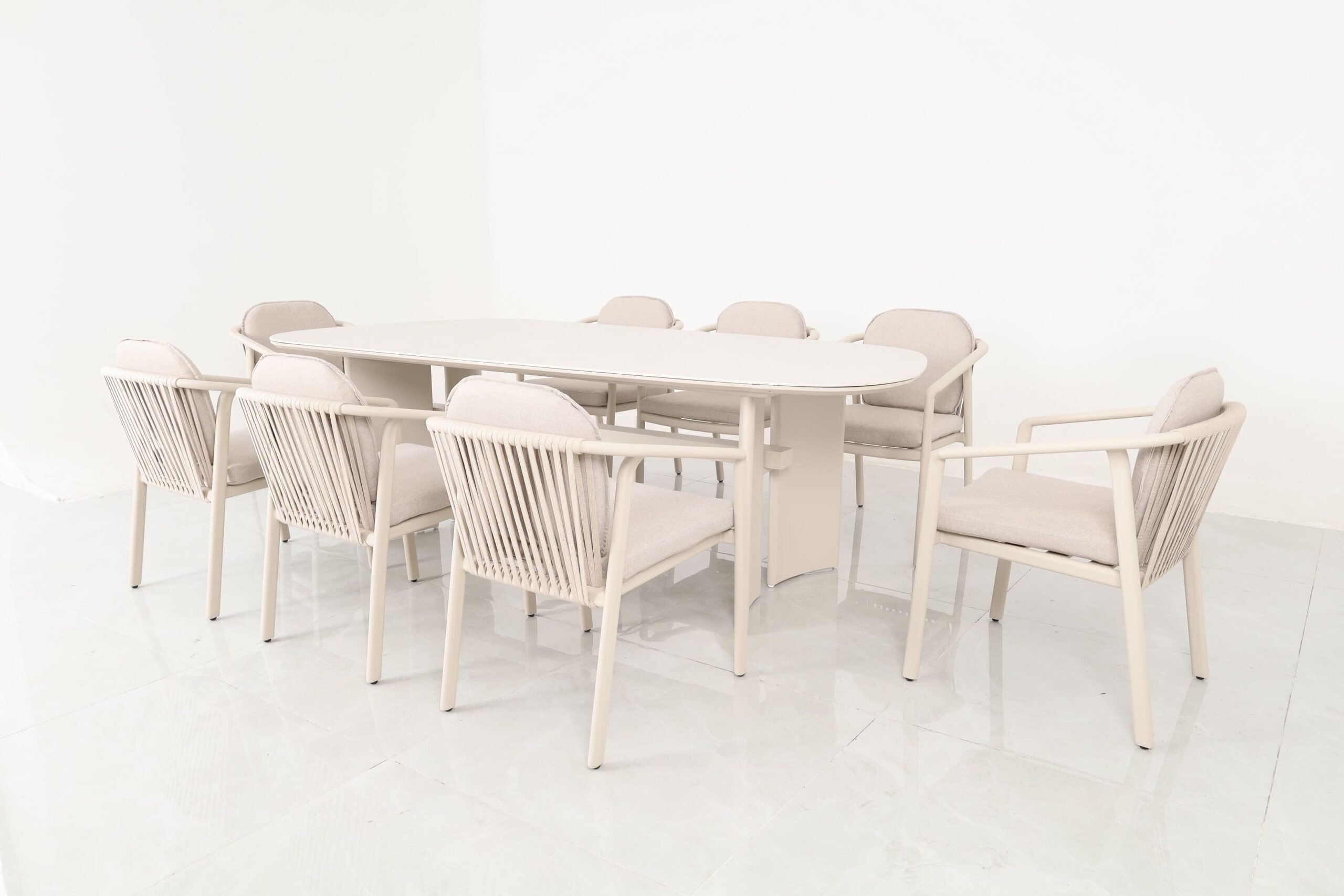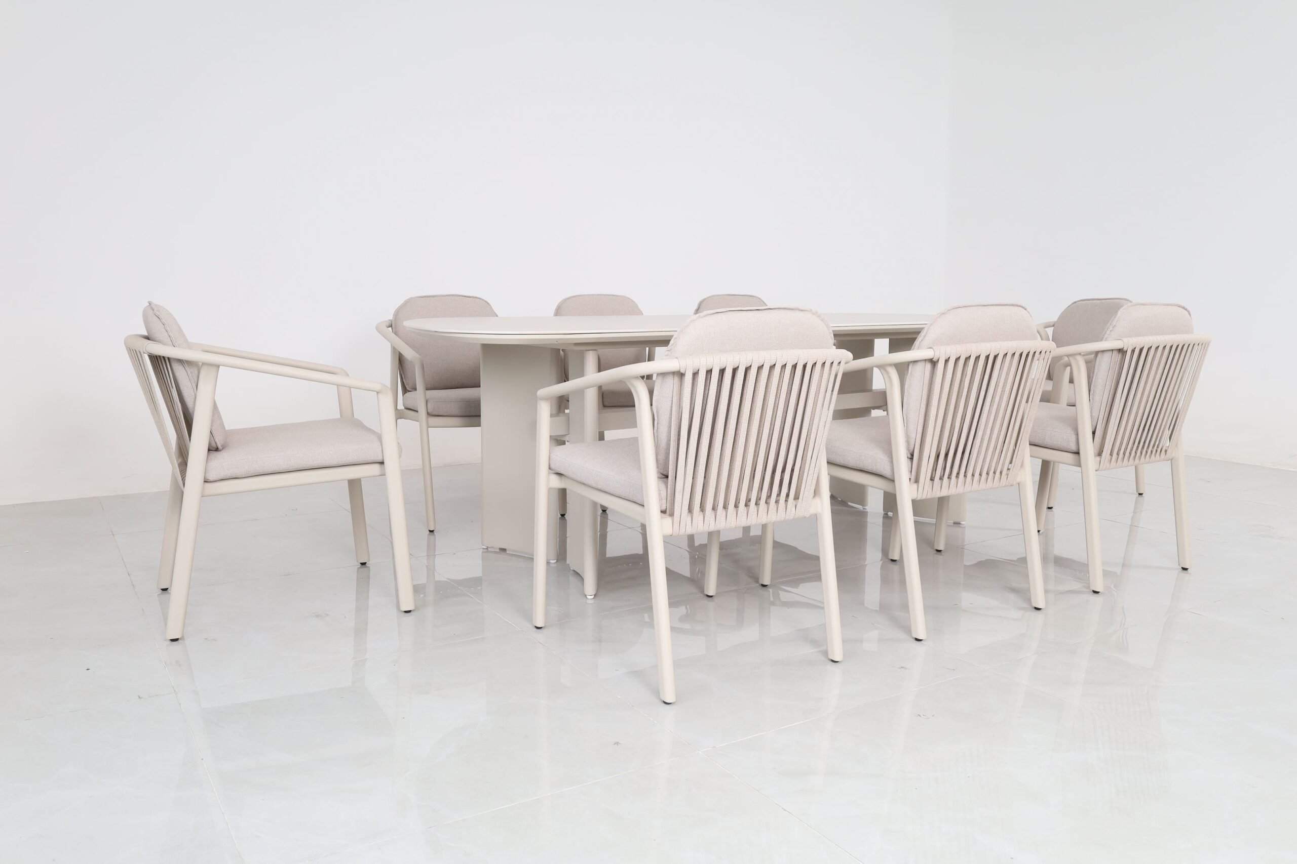 Tati table is a modern and durable dining table designed for outdoor use. It features a sturdy beige aluminium frame paired with a refined light grey ceramic fiber tabletop, offering excellent resistance to weather and daily wear. With its generous dimensions 240 x 106 x 76 cm, the Tati Table is ideal for outdoor dining areas, terraces, and hospitality settings, combining functionality with a clean, contemporary aesthetic.